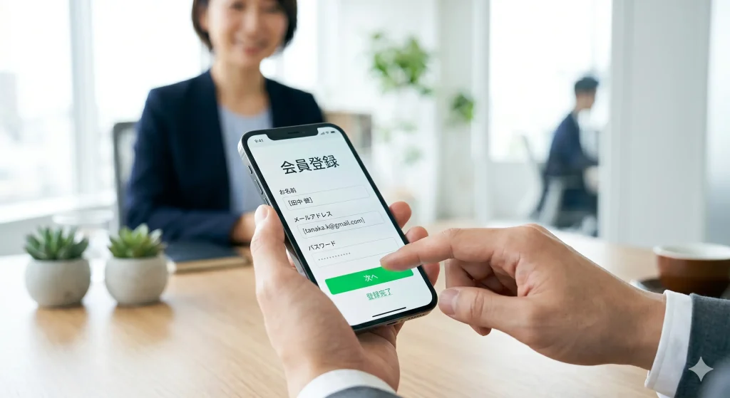 公式サイトのフォームから基本情報を入力するだけで、数分で完了します。スマートフォンからでも簡単に行えます。