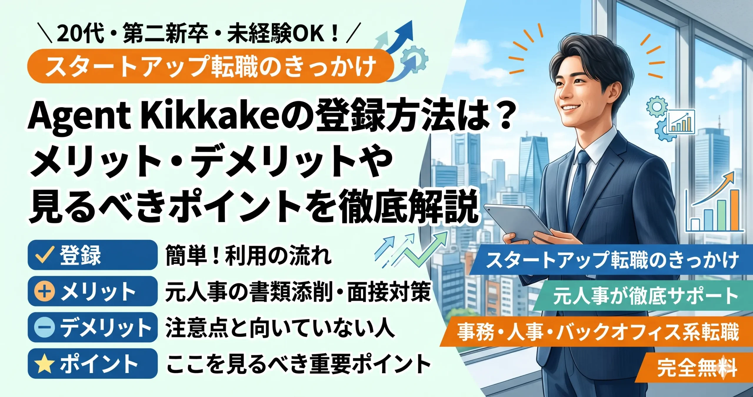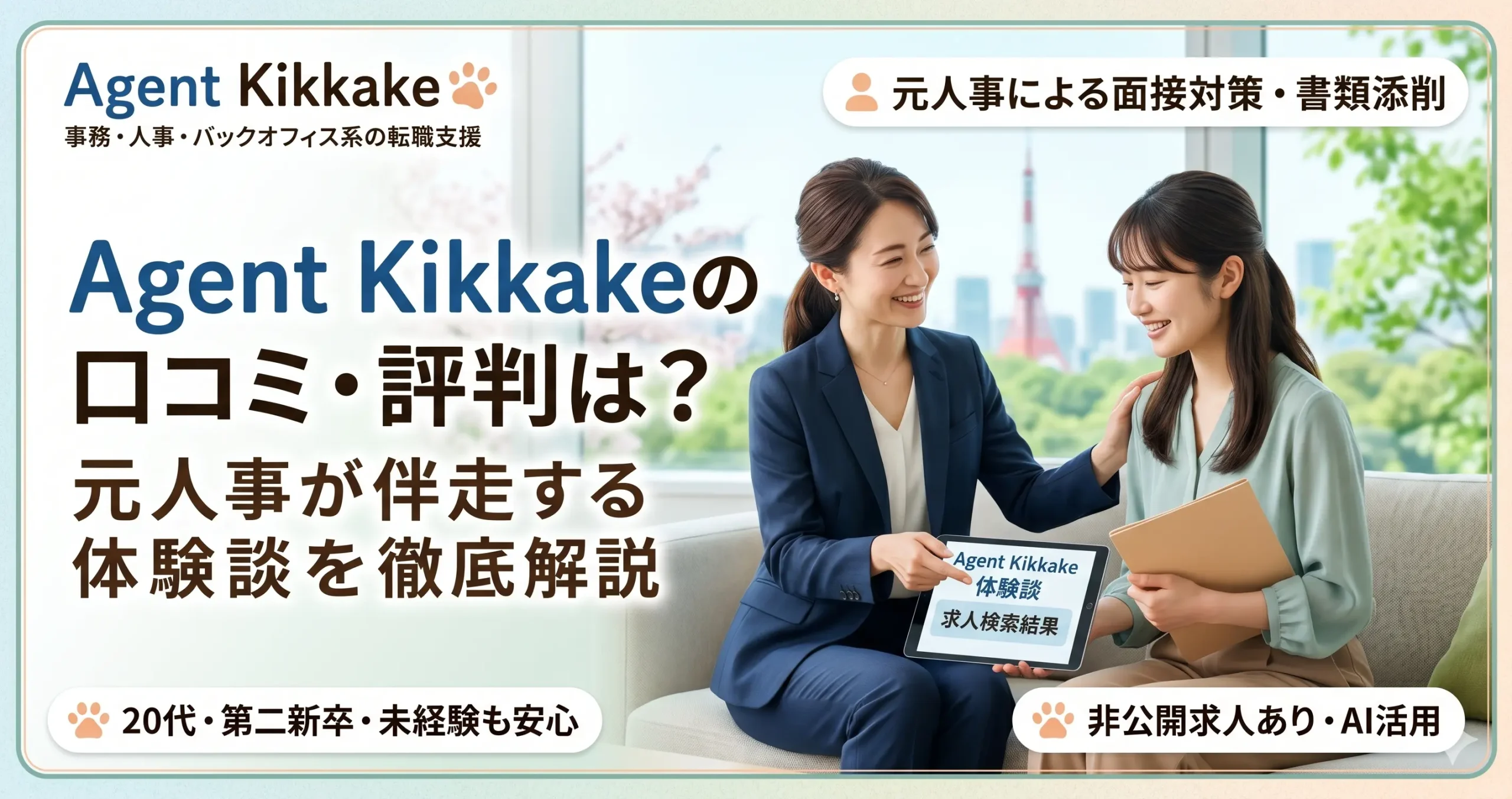 | Agent Kikkake | 元人事による伴走型支援。事務・人事などバックオフィス転職と相性が良い。 | 20代、第二新卒、未経験、書類や面接に不安がある人 | 書類添削・面接対策・キャリア整理をじっくり進めやすい | 求職者は無料相談から利用しやすい | 丁寧な伴走支援や親身な対応を評価する口コミが中心 |
