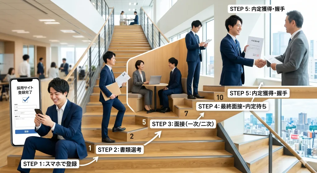 登録から内定まで、どのようなステップで進むのか事前にイメージしておきましょう。