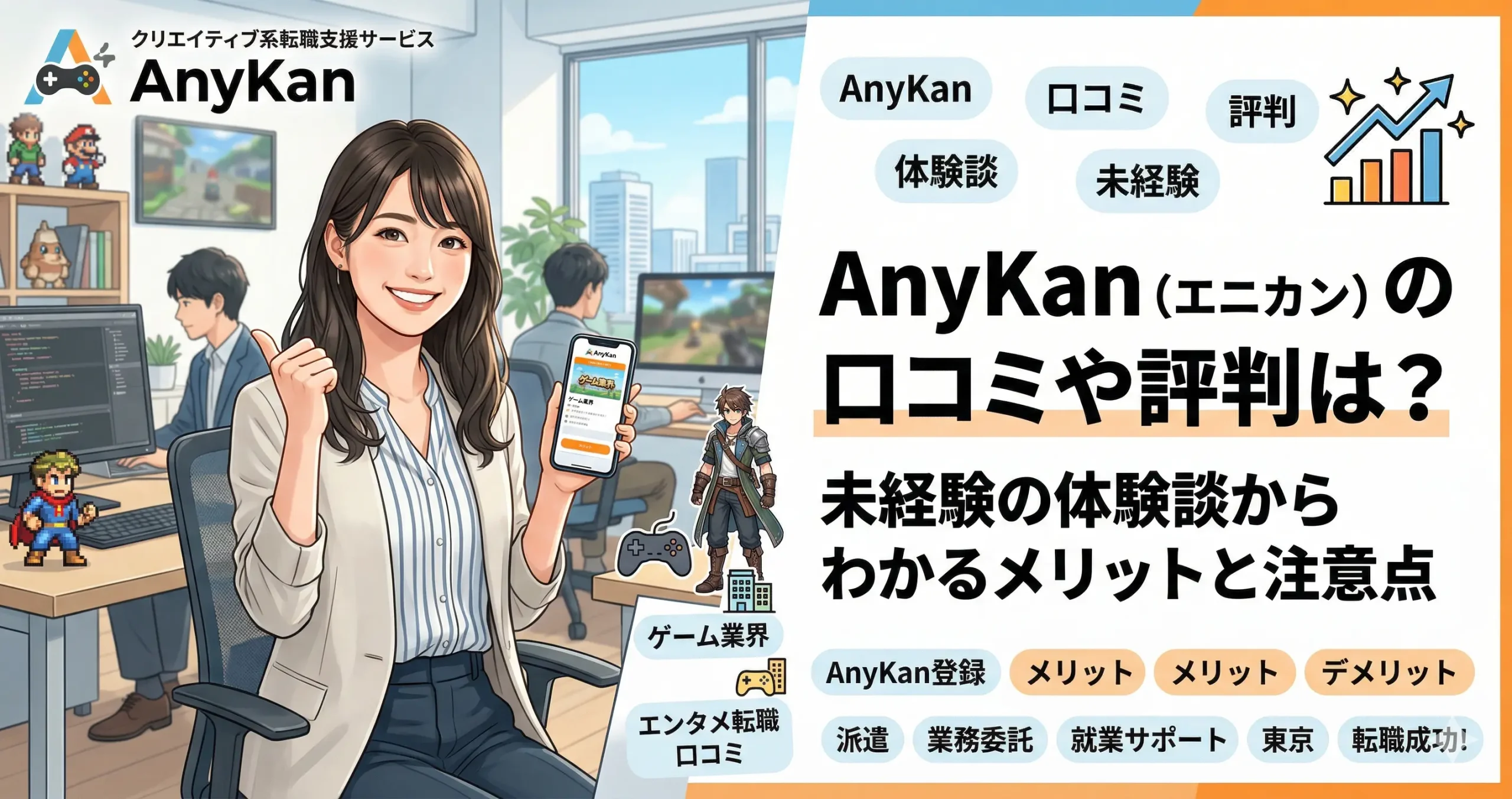 AnyKanゲーム・エンタメ・Web業界を視野に入れて転職活動を進めやすい業界経験を活かしてキャリアアップしたい人非公開求人、FAQ、問い合わせ導線のわかりやすさ業界経験者から比較候補として挙がりやすい