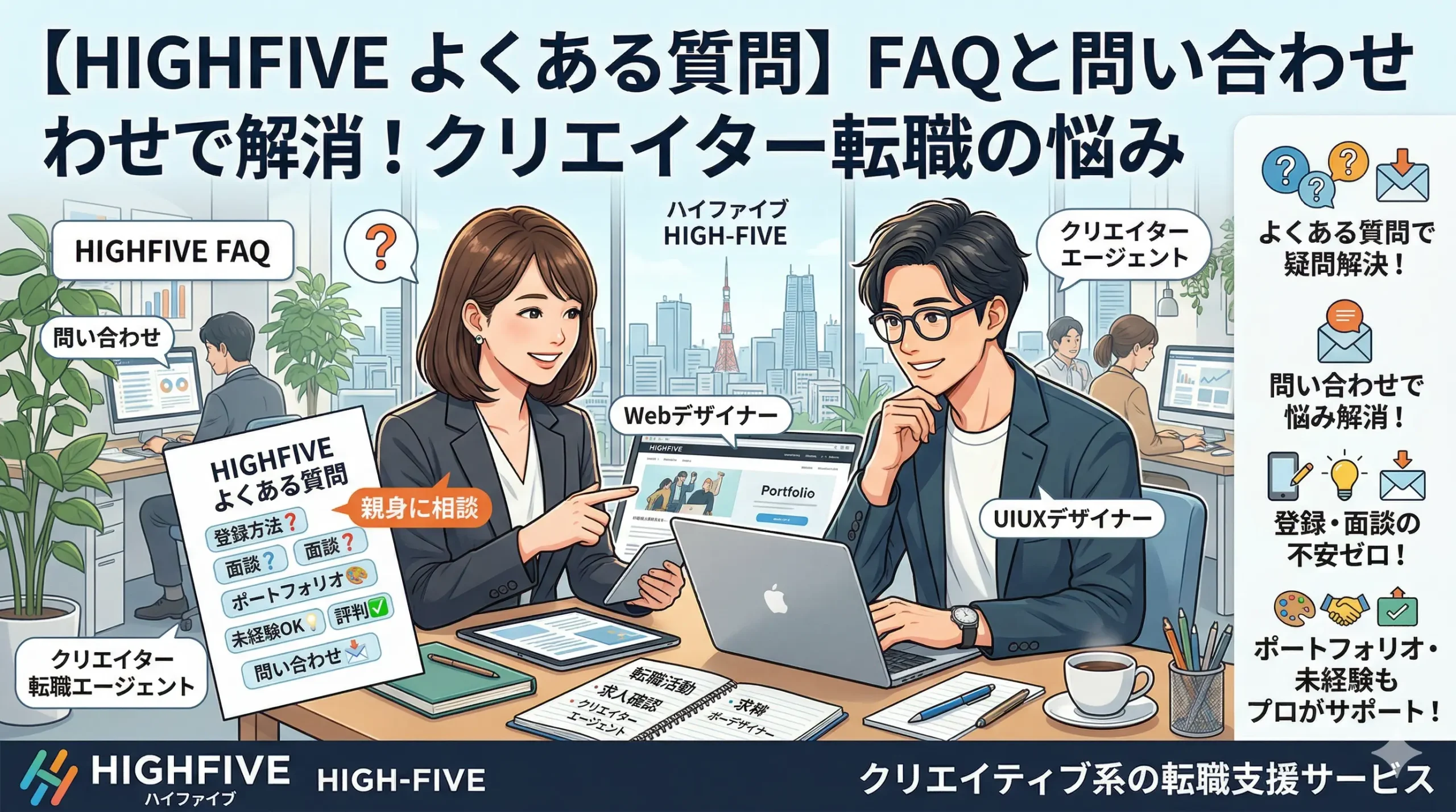 | HIGH-FIVE | クリエイティブ系の転職支援サービス | クリエイティブ職に特化し、ポートフォリオや面談の質を重視しやすい | 量より質を重視し、厳選求人を見たい人 | ポートフォリオ相談やキャリア面談を軸に進めやすい | 面談の丁寧さや自分との相性を確認したい人向け |