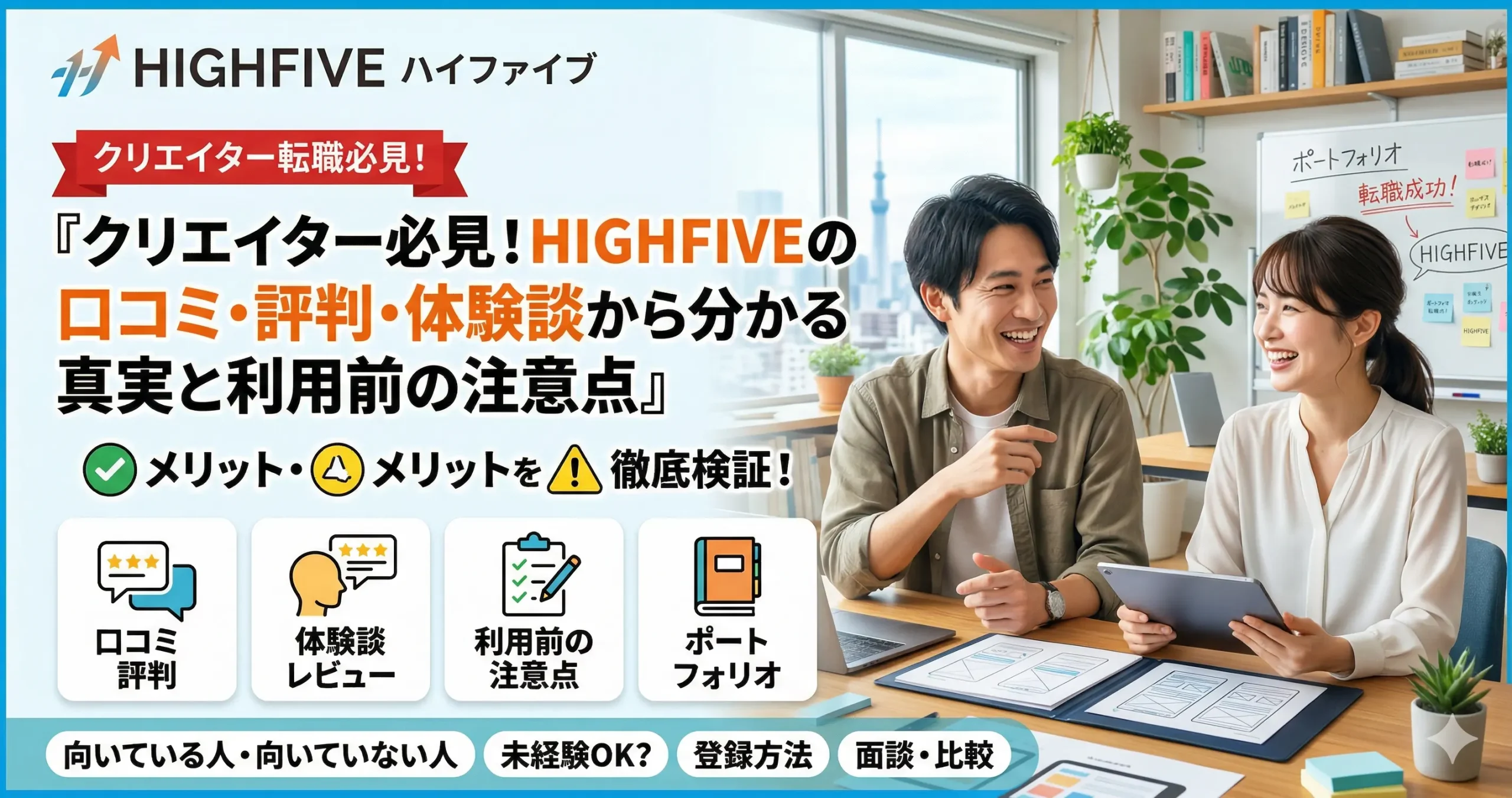 比較表を見ると、HIGHFIVEは「クリエイティブ職に特化」「ポートフォリオや面談の質を重視」したい人に向いている一方で、他社も含めて見比べることで、より自分に合うサービスを選びやすくなります。